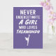 Celebrate the strength and passion of a young martial artist with this adorable pink card, featuring the powerful quote: **"Never Underestimate A Girl Who Loves Taekwondo."** This **unique** and **themed** design is the perfect way to empower the **TKD** student, future **fighter**, or martial arts **lover** in your life. It’s a heartfelt and **related** present that captures the true spirit of a dedicated young athlete.