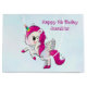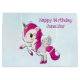 Gift bag with a white winged unicorn with pink mane, tail and hooves. The horn has rings of rainbow colour and looks like a candy lollipop. This cute unicorn is rearing up on its back legs. Sweet pink heart on its cheek and long girly eyelashes.