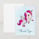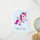 Thank You card with a white winged unicorn with pink mane, tail and hooves. The horn has a rings of rainbow colour and looks like a candy lollipop. This cute unicorn is rearing up on its back legs. Sweet pink heart on its cheek.
