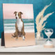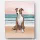 Cute Pitbull Dog Sitting on Beach with sunset Plaque