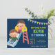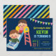 Amaze your guests with this colourful birthday party invitation featuring a cute children's slide with vibrant typography against a blue background. Simply add your event details on this easy-to-use template to make it a one-of-a-kind invitation. Flip the card over to reveal a colourful stripes pattern on the back of the card.