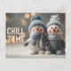This charming and cozy winter scene features two adorable plush snowman dolls sitting on snow. They are wearing blue and gray knit hats and scarves, and the image is overlaid with the text "CHILL TIME." The soft focus background of warm bokeh lights creates a perfect atmosphere.