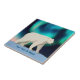 A cute polar bear (Ursus maritimus), done in a simple primitive, or naive style, walks on the polar ice, the Aurora Borealis (Northern Lights) glow brightly in the background. Customise by adding your own text.