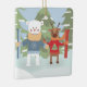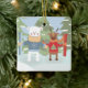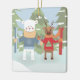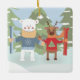 An adorable Christmas ornament featuring a cartoon polar bear and reindeer ready to go skiing .