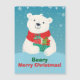 Delight your loved ones this holiday season with this adorable Christmas card featuring a smiling polar bear wearing a red scarf and holding a stack of beautifully wrapped gifts with bows. The front design is set against an icy blue gradient background with falling snowflakes, creating a cheerful winter vibe. The playful text, "Beary Merry Christmas!", adds a fun and festive touch. Fully customisable, this card is perfect for spreading joy and warmth during the holidays!