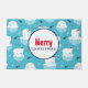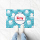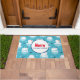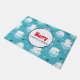 A Merry Christmas door mat with a cute Christmas pattern featuring polar bears standing on floating ice wearing red santa hats. Little igloos, snowflakes and fish surround these adorable polar bears chilling on the water. Light blue background. A white circle with a blue border layered over top, with Merry Christmas written inside. Cute and whimsical holiday design.