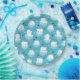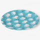 Paper plates with a cute Christmas pattern featuring polar bears standing on floating ice wearing red santa hats. Little igloos, snowflakes and fish surround these adorable polar bears chilling on the water. Light blue background. Cute and whimsical holiday design.