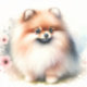A fluffy Pomeranian dog with a vibrant orange and white coat, featuring large, expressive eyes and a cheerful expression. It stands amidst soft, pastel-coloured flowers and gentle watercolor splashes, creating a warm and inviting atmosphere. The background is light and airy, enhancing the dog's fluffy fur and playful demeanour.