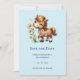 Save the date card with an adorable illustration. A little brown pony happily eating daisies.