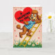 This cute dog greeting card shows a vintage-style scene with a brown, poodle-like dog climbing a bright yellow ladder toward a huge red heart. The dog has textured fur, wide eyes, and a big happy smile, and it’s wearing a blue-and-white striped shirt. In the upper left area, the large heart carries the message “A VALENTINE For YOU” in black block letters, with “For YOU” standing out clearly. The background is soft pink with a few small red hearts scattered around, keeping the focus on love and friendship. At the bottom, there’s green grass with simple white daisies that ground the scene and make it feel sweet and familiar. The diagonal layout leads your eye from the flowers up the ladder to the heart, like the dog is working hard to deliver a loving note ❤️💌.