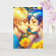 A Valentine's Day card with an anime blonde haired man and blue haired woman nose to nose in yellow flowers about to kiss in love.