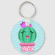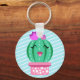 Cute potted kawaii round cactus key chain with a white stripes and blue background.