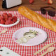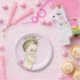 Adorable princess baby girl wearing ruffle pants and bunny slippers princess baby shower plates. These cute princess baby shower paper plates can be customised with text in the font style and colour of your choice, and you can choose your own background colour.