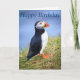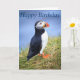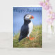 A single cute colourful puffin bird against a blue ocean on green grass, with message Happy Birthday