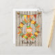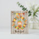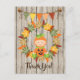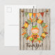 This Autumn Thank You! postcard features a cute baby dressed in a pumpkin costume sitting in a wreath of colourful fall leaves. There is also a bunting banner with acorns and a faux wooden background.
