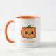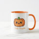 A mug with a cute pumpkin in Kawaii style and customisable text: perfect for having your coffee on Halloween!