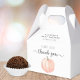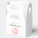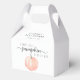 A cute gender-neutral baby shower favour box featuring a pastel orange pumpkin watercolor and "a sweet little thank you" and "a sweet little pumpkin is on its way" in simple grey typography and a stylish script with swashes. Personalise the mother's name and shower date in coordinating grey typography. Specify the baby’s gender if desired (e.g., "is on his way").