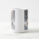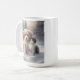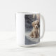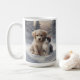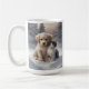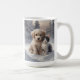 Coffee mug with an adorable puppy and kitten posing in the snow.