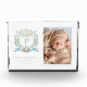 This sweet baby announcement photo block is a perfect way to announce the arrival of your new baby. The design features a monogram crest with a blue ribbon and a cute puppy. Introduce your baby with the details of your new baby's special day and a newborn photo.