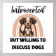 This funny and relatable graphic is perfect for any introvert who has a soft spot for pups. It features the hilarious quote "Introverted But Willing to Discuss Dogs" paired with an adorable, sweet watercolor-style puppy. The cute dog is set against a trendy, neutral-toned boho rainbow. It's the ideal design for shy dog lovers, dog moms, dog dads, or anyone who feels more comfortable talking about animals than making small talk. A perfect ice-breaker that sets the right expectations!