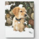 cute yellow golden retriever playing in the snow against field stone wall with ivy