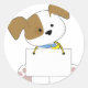 A sweet little puppy sitting with a blank sign around its neck. There is room to add your own text.