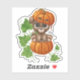 A cute puppy with big eyes in a pumpkin hat on his head sits on a large orange ripe pumpkin with foliage and guards his owners on Halloween