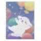 A cute fluffy white puppy with colorful balloons in night sky filled with stars