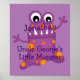 Here's a cute purple blob monster with big eyes, sharp teeth, and orange spots, all on a lavender background. It's full of fun and wants to be Your Little Monster's funny friend. Whether you're Mum, Dad, Auntie, Uncle, Gran, or Madison the Babysitter, you can add the youngster's name and yours, and they'll have a totally unique child's custom cartoon poster that's all their own.