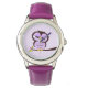 Stylish custom watch features a sweet vector illustration of an owl perched on a tree branch on a polka dots pattern background. Babystar Design at mygrafico.com