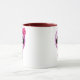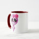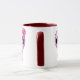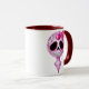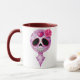 This lovable purple sugar skull is decorated with tribal swirls and drops with a large violet heart in the middle of the forehead. A single red rose sits on the side of the round skull just above the large black eyes. Flower pedals surround the eyes and the mouth has stitches that make their way up the side of the cheek. This mug design is an adorable example of this Day of the Dead symbol.