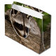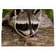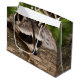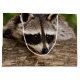A gift bag with a photograph of a cute and curious racoon resting his face on a wooden log. Adorable.