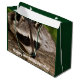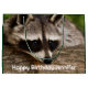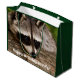 A gift bag with a photograph of a cute and curious racoon resting his face on a wooden log. Adorable.