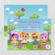 Start your little girls birthday party off right with our cute rag doll birthday invitation featuring a group of 4 rag dolls on a green lawn with cute polka dotted trees with a blue sky and a cute zebra, mouse, bird and little sheep. We offer a cute matching back for an extra special touch. A popular invitation for a sleepover pajama party. Cute for a sweet girls birthday party. Visit our shop to view other stylish & popular birthday party invitations & matching thank you notes, stickers & postage stamps. © Babystar designs