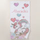 This enchanting custom beach towel features a magical unicorn theme. A cute unicorn with pink hair and a gold glitter horn is placed in the centre, above a bouquet of pastel coloured roses. A pretty rainbow and matching hearts is printed behind the unicorn. A sample name is printed at the top in a whimsical pink font which you can personalise to include your own name or custom text.