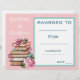 A bright colourful Reading Award Certificate suitable for use by a teacher for a school classroom or school assembly presentation. This pink certificate features a picture of library books and is able to be personalised to include student's name and personal achievement. Date and teacher's name also can be personalised. Simple and easy to fill out. Good teacher's resource.