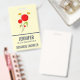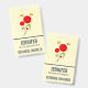 Name tag with a charming drawing of several whimsical red flowers with fat hearts attached to a green stem. 2 yellow butterflies hovering nearby. Sketched with a black outline. Whimsical and cute design.