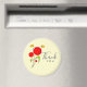 A thank you magnet with a whimsical illustration of several red flowers with big hearts attached to a stem with green leaves. 2 quaint yellow butterflies hovering nearby. Light yellow background.
