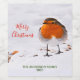A traditional winter and Christmas theme for Your Christmas, Holiday party and dinner. A cute red Robin coming to a garden, backyard for the sunflower seeds lying in the snow. White background (the snow) Colours of the nature: Orange, brown and white. With the text: Merry Christmas written with a modern hand lettered style script. Template for your family name and year. Red and green text.