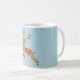 A cute reindeer leaps through a snowfall on a light blue background on this fun and festive holiday coffee mug.