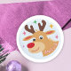 Cute Reindeer Kid`s Name Christmas Gift Classic Round Sticker. Funny cartoon reindeer with a red nose with colourful stars. The sticker has a name template - personalise the sticker with your name.