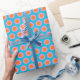 This vibrant and playful wrapping paper features a bright turquoise, pink, and orange retro 60s pop flower pattern.