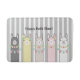 The product design features an illustration of 5 retro colourful decorated llamas. This adorable animal design with white stripes makes a cute modern and unique bath mat with personalised text and background colour for little girl bathroom.