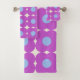 This stylish bath towel set features a fun retro flower pattern in purple and blue.