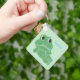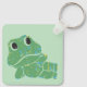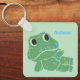 Create an un-froggettable gift when you add a name to this keychain. It features a cute retro style frog illustration. The green cartoon frog has blue and yellow speckles. Your name or other text appears in bright blue lettering.