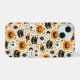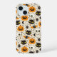 This design presents a cute and whimsical Halloween pattern filled with a delightful assortment of classic spooky icons. The background is a light cream colour, providing a soft contrast to the bold designs. The pattern includes playful jack-o'-lanterns with different expressions, black cats with bright yellow eyes, smiling skulls, and friendly bats with orange wings. Scattered throughout are spiders, crescent moons, stars, mushrooms, and magical symbols, all adding to the enchanting Halloween atmosphere. The colour palette features striking blacks, oranges, and yellows, creating a lively and festive design perfect for Halloween decorations, clothing, or party themes. The overall feel is fun and charming, ideal for celebrating the spooky season with a touch of sweetness.