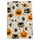 This design presents a cute and whimsical Halloween pattern filled with a delightful assortment of classic spooky icons. The background is a light cream colour, providing a soft contrast to the bold designs. The pattern includes playful jack-o'-lanterns with different expressions, black cats with bright yellow eyes, smiling skulls, and friendly bats with orange wings. Scattered throughout are spiders, crescent moons, stars, mushrooms, and magical symbols, all adding to the enchanting Halloween atmosphere. The colour palette features striking blacks, oranges, and yellows, creating a lively and festive design perfect for Halloween decorations, clothing, or party themes. The overall feel is fun and charming, ideal for celebrating the spooky season with a touch of sweetness.