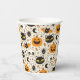 This design presents a cute and whimsical Halloween pattern filled with a delightful assortment of classic spooky icons. The background is a light cream colour, providing a soft contrast to the bold designs. The pattern includes playful jack-o'-lanterns with different expressions, black cats with bright yellow eyes, smiling skulls, and friendly bats with orange wings. Scattered throughout are spiders, crescent moons, stars, mushrooms, and magical symbols, all adding to the enchanting Halloween atmosphere. The colour palette features striking blacks, oranges, and yellows, creating a lively and festive design perfect for Halloween decorations, clothing, or party themes. The overall feel is fun and charming, ideal for celebrating the spooky season with a touch of sweetness.