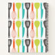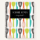 Retro recipe book printed with a cooking pattern with kitchen utensils adorned with little hearts. Balloon whisks, knives, spatulas, and ladles in lime green, turquoise, grey, orange. Personalise with your name in elegant retro letters. Recipe book is written in a charming script.
