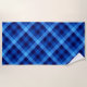 A beach towel featuring a cool plaid pattern design in pretty ocean blue.
